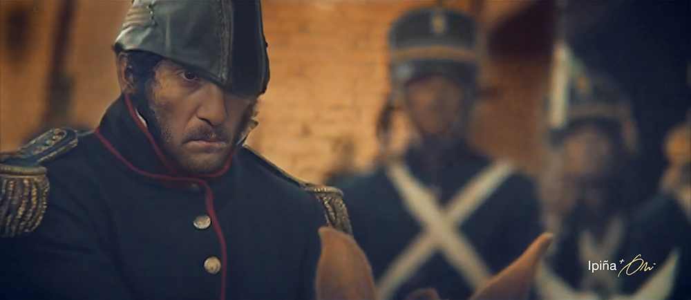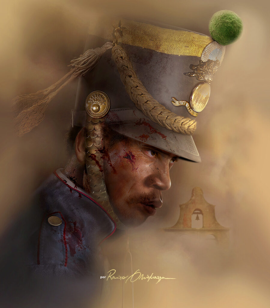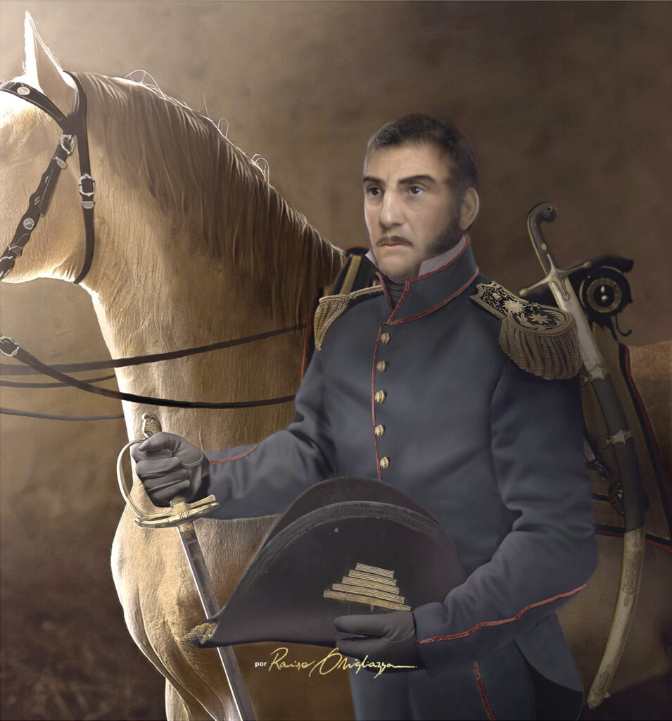 Imagen recreada combinando el retrato de José de San Martín basado en el Daguerrotipo de 1848 llevado al año 1813, realizado por Ramiro Ghigliazza . El artista en esta oportunidad tomó como base uan escena del film, El Combate de San Lorenzo con la debida autorización de su director Leandro Ipiña.
