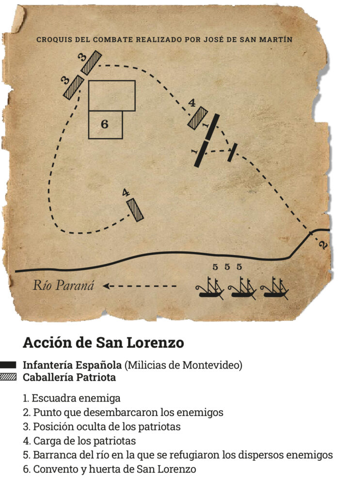 Exmo Señor. Tengo el honor de decir a V. E. que en el día 3 de febrero los granaderos de mi mando en su primer ensayo han agregado un nuevo triunfo á las armas de la patria. Los enemigos en número de 250 hombres desembarcaron a las 5 y media de la mañana en el puerto de S. Lorenzo, y se dirigieron sin oposición al colegio S. Carlos conforme al plan que tenían meditado en dos divisiones de a 60 hombres cada una, los ataques por derecha e izquierda, hicieron no obstante una esforzada resistencia sostenida por los fuegos de los buques, pero no capaz de contener el intrépido arrojo con que los granaderos cargaron sobre ellos sable en mano: al punto se replegaron en fuga a las bajadas dejando en el campo de batalla 40 muertos, 14 prisioneros de ellos, 12 heridos sin incluir los que se desplomaron, y llevaron consigo, que por los regueros de sangre, que se ven en las barrancas considero mayor número. Dos cañones, 40 fusiles, 4 bayonetas, y una bandera que pongo en manos de V. E. y la arrancó con la vida al abanderado el valiente oficial D. Hipolito Bouchard. De nuestra parte se han perdido 26 hombres, 6 muertos, y los demás heridos, de este número son: el capitán D. Justo Bermúdez, y el teniente Manuel Díaz Vélez, que avanzándose con energía hasta el borde de la barranca cayó este recomendable oficial en manos del enemigo.
