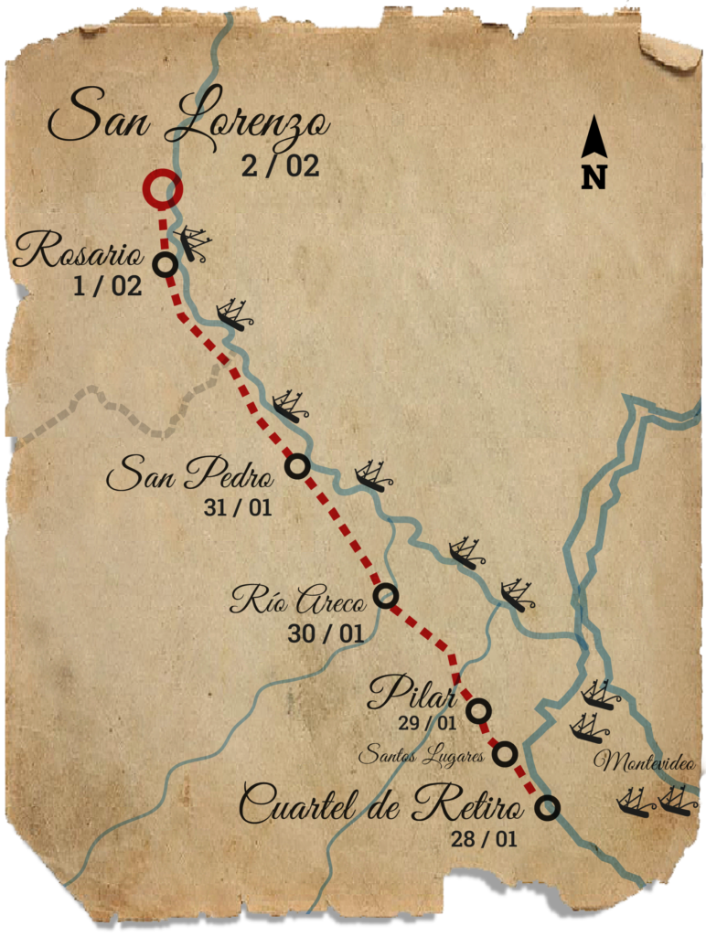 El 1º de febrero el contingente estaba en Rosario y al anochecer del 2 de febrero, completaban su itinerario arribando a San Lorenzo, donde en la jornada siguiente tendría lugar el primer y único hecho de armas, en el cual participó San Martín en su patria.
