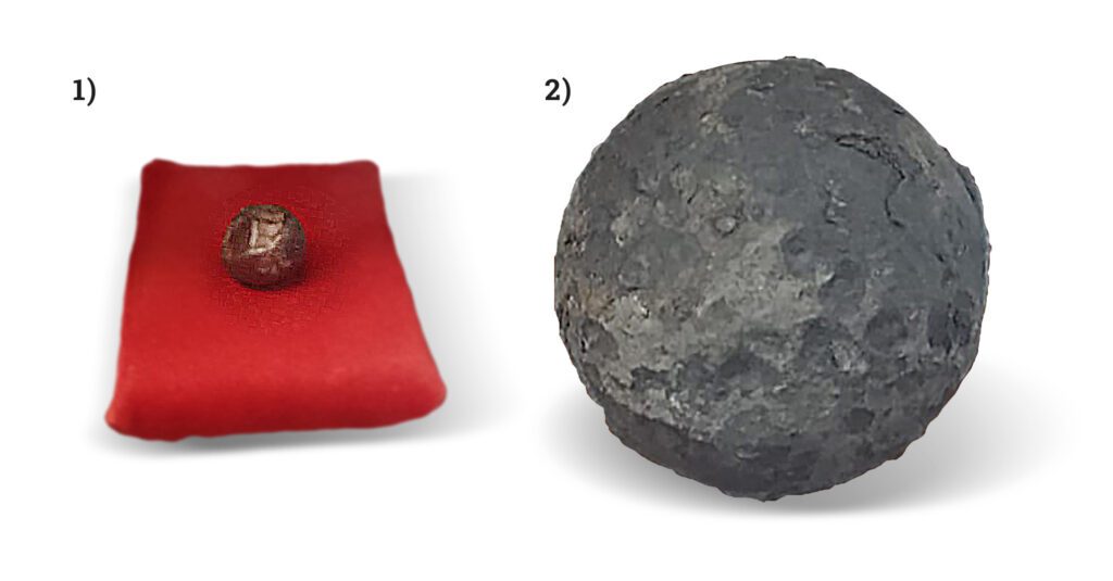 Bala extraída del cuerpo de un granadero. 2 Bala de cañón lanzada el día del Combate.
